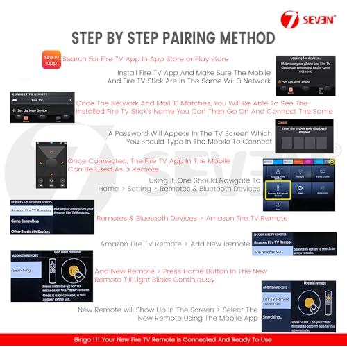 How to Pair: There are 3 Method\’s to get pair 7SEVEN remote control with FireTv Stick Device. Method 1: Simply hold Home Key for 10-15 seconds within 3 meters distance and get paired, if not paired Opt Next process. Method 2- Step 1- Restart your Fire TV Stick:Unplug the Fire TV Stick and plug it back in 60 seconds later. Step 2- Reset the remote (for some models):Press and hold Back + Menu + Left on the navigation ring for 10 seconds, then hold the Home button for 10 seconds.