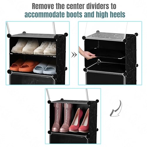 MATERIAL & DIMENSION: Made of PP plastic panels, rustproof steel frames, plastic connectors, small wooden hammer. The shoes organizer which is waterproof and dust-resistant measures: L 40 x B 30 x H 90 cm, each cube measures L 40 x B 30 x H 30 cm, With center dividers L 40 x B 30 x H 15 cm which fits shoes up to size 12.