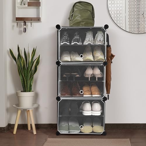 SHOE RACK with DOOR: The footwear stand for home consists of 3 cubes that can hold up to 12 pairs of shoes with a side hanger, and a small hammer. Each cube with door has 2 shelves to hold up to 4 pairs of kids /men / women footwear and features hole handles for air circulation and odor prevention.