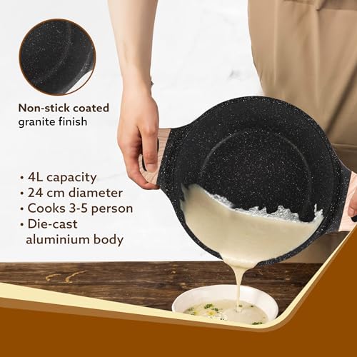 The casserole is made from cast aluminium body with a non stick coated granite finish inner layer