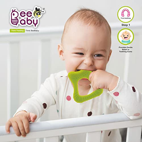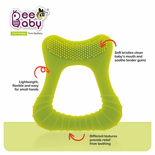 The soft silicone and multiple teething textures provide stimulation to gums and provide comfort to baby’s delicate gums.