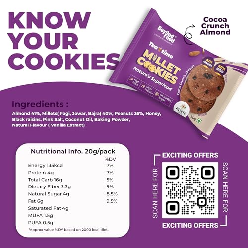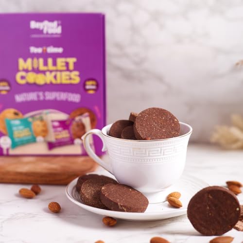 Beyond Food Sugar-Free Millet Cookies: Indulge in high-protein, Fibre-rich millet cookies made with Ragi, Jowar, Bajra, Almonds, and natural flavors. This assorted pack of 12 cookies includes Crunchy Almond and Honey Cocoa variants, offering a delightful snacking experience for health-conscious individuals. Perfect sugar-free cookies for kids and adults alike.