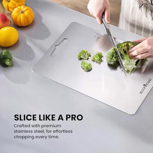 PREMIUM STAINLESS STEEL CONSTRUCTION: Crafted from high-grade stainless steel chopper board, the Bloomingdale vegetable cutting board offers unparalleled durability and resistance to rust. Its heavy-duty design ensures longevity, while its sleek, modern appearance adds a stylish touch to any kitchen. Ideal for chopping vegetables, meat, fruits, and more, it\’s built for frequent use and minimal maintenance.
