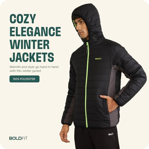 Boldfit Men\’s Quilted Polyester Standard Length Jacket Monsoon Winter Wear Hooded Winter Padded Bomber Full Sleeve Jacket Black Charcoal 2XL