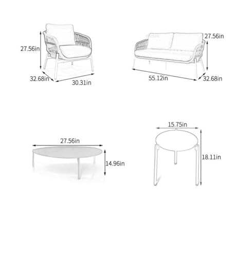 Product Dimensions : 2 Seater sofa- 27\”H x 32\”L x 55\” W , 1 Seater sofa- 27\” H x 32\”L x 30\” W, Table1- 14\” H x 27\”L, Table- 18\” H x 15\”Dia.