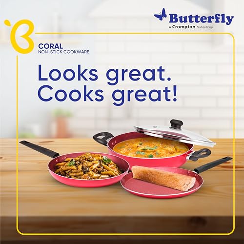 Butterfly Coral DLX KCP 3 Non Stick Cookware Set| Tawa 250 MM | Fry Pan 240 MM | Kadai 240 MM | Induction Base| Premium Virgin Aluminum | PFOA Free | Scratch Resistant | Velvet Red