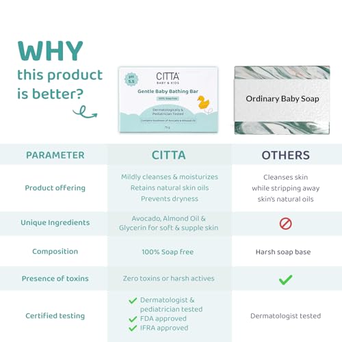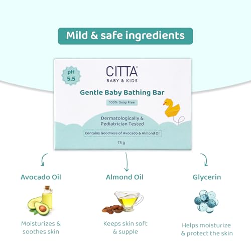 NATURAL AND NOURISHING INGREDIENTS: The CITTA Gentle Baby Bathing Bar is a 100% soap free and gentle bathing solution that cleanses and nourishes your baby’s delicate skin. Unlike any other baby soap for bath, this bathing bar is formulated with carefully chosen natural ingredients and ensures a soothing baby bath time. The soap free bar is formulated with avocado oil, almond oil, and glycerin, combined to provide moisture retention, skin nourishment, and protection. Perfect for everyday use, this bathing bar is a must-have for new parents who seek safe, effective baby bath time for their little ones!
