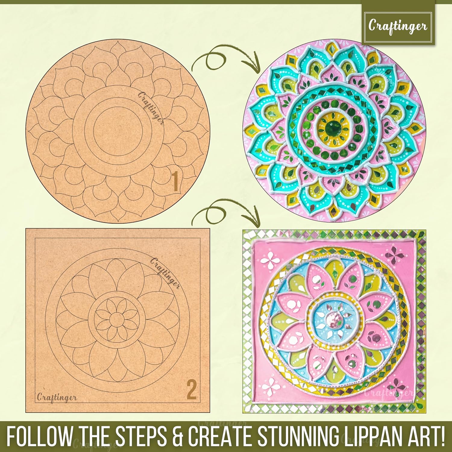 Everything You Need: Complete Lippan art kit with 2 pre-marked 8-inch MDF boards (round and square), 1 extra 8-inch round MDF board, and all necessary materials.