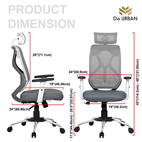 SPECIFICATIONS – Seat frame material – Nylon | Internal Seat Material: Wood |Cushioned Seat Thickness : 3.9 INCHES| Filled with – PU | Swivel: 360º swivel | Seat Cover: Mesh | Color: Grey | Size: High Back | Tilt Lock | Gas-lift: Class 4 | Base: Heavy Duty Metal Base | Castors: Nylon Dual Wheels | Maximum Weight Capacity: Up to 120 Kgs | Height Adjustment :45\”-48\” INCHES | Seat Width : 19\” INCHES| Seat Depth : 19 INCHES| Seat Height : 17.5 – 20.5\” INCHES| Back Height : 28\” INCHES|