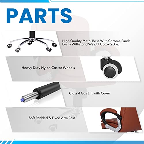 SPECIFICATIONS – Internal seat material: Wood | Filled with – High Density Foam | Upholstery cover: Leatherette | Color: Tan | Size: Mid Back | Tilt Lock | Gas-lift: Class 4 | Base: Heavy Duty Metal Base | Castors: Nylon Dual Color Wheels | Maximum Weight Capacity: Up to 120 Kgs | Height Adjustment : 33-36 INCHES | Seat Height : 20-23 INCHES | Seat Width :19 INCHES |Seat Depth : 17 INCHES | Back Height : 18 INCHES |