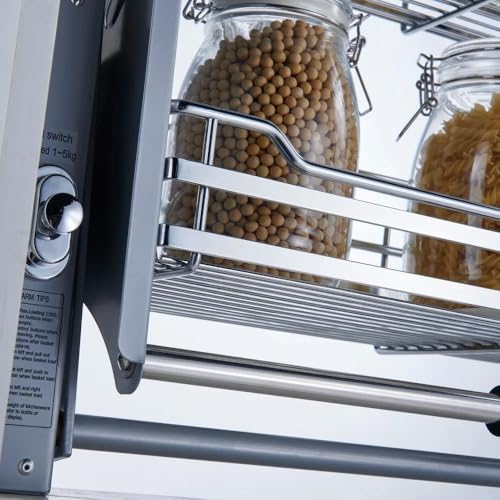 Two tier wire shelf pulls down for easy access to wall cabinet contents. Maximum load bearing of 15KG.
