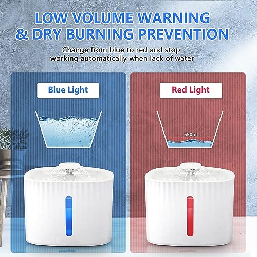【Low Volume Warning & Ultra-quiet Pump】When the water is insufficient, the light of water pump will automatically turn red from blue to remind you to increase the water. At the same time, the pump will automatically shut off to prevent idling which can help improve the service life of water pump. The water pump of Jainsons cat fountain water bowl is powerful but super quiet. The super quiet pump is running below 40 dB, which will not affect your or your pet’s sleep.