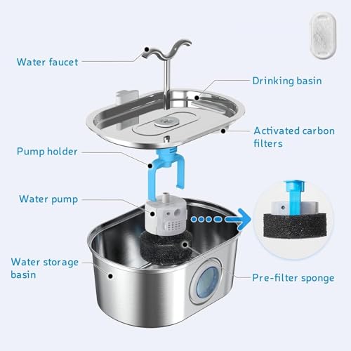🐶 Double Filtration System: The pet water dispenser is equipped with a double filtration system, consisting of an activated carbon filter and a replaceable round filter sponge. The external foam filter of the pump can filter impurities and capture hair, while the activated carbon filter can remove odors and soften water quality, improving taste and providing purer and fresher water for your lovely pets.