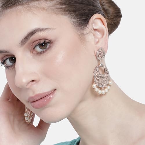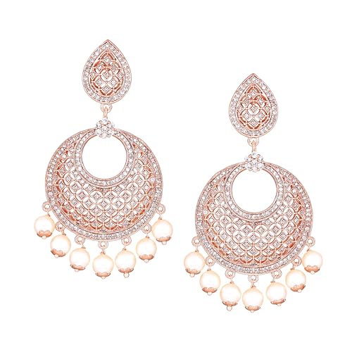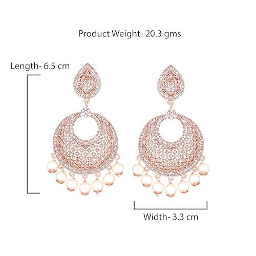 Material:Brass;Plating:Rosegold ;Occasion:Festive,Wedding;Closure Type:Post and Back Stone Type:Cubic Zirconia,Stone Color:White Dimensions:Length:6.5 Cm;Width:3.3 Cm;Weight:20 Gms Pack Contains: 1 Pair of Earrings