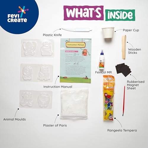 This DIY paint and craft kit contains a blunt penknife, animal molds, a rubberised magnet sheet, a measuring cup, Fevicol, Plaster of Paris packet and much more.