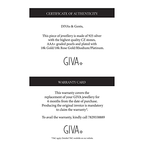 WARRANTY: GIVA offers a manufacturer\’s warranty* that covers the replacement of your GIVA Jewellery for 6 months from the date of purchase & Free Lifetime Plating Service . Providing the original invoice is mandatory. *T&C apply, detailed T&C available on our website
