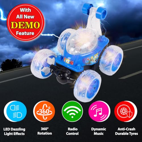 360° Rotating R/C Stunt Car With Demo Feature: Now Gooyo Stunt Toy Car comes with DEMO feature. This cool racing car can do all sorts of tricks. Double sides running, moving forward, backward, turning left, right, 360 degree tumbling flip for different playing experience on this electric remote control stunt car. You can control the RC cars for kids in any direction with its remote controller. This remote control car can race, and, perform double-sided driving, 360° spins and flip with its LED dazzling headlights.