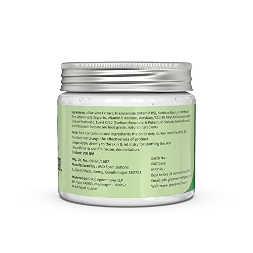 GREEN WORTH Pure Aloe Vera Gel for face, skin and hair | with Vit B3, E and Pro-Vit B5 | 200 gms