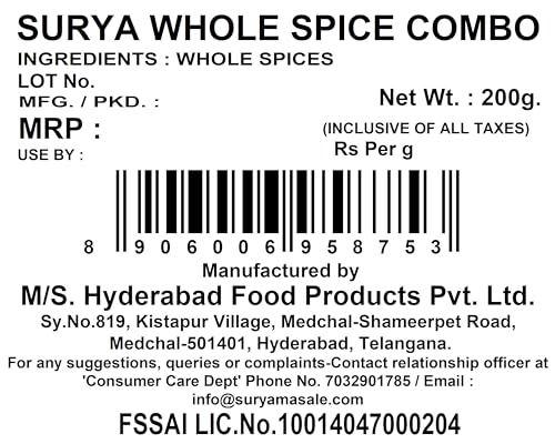 Weight : 200gm Shelf life : 12 Months Includes 10 packs of whole spices; 20 grams each; nutmeg; star anise; black cardamom