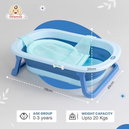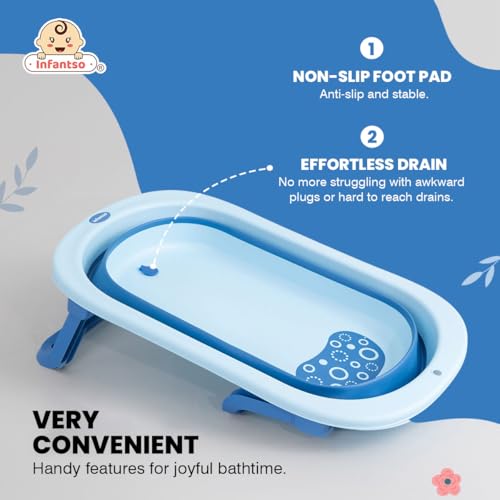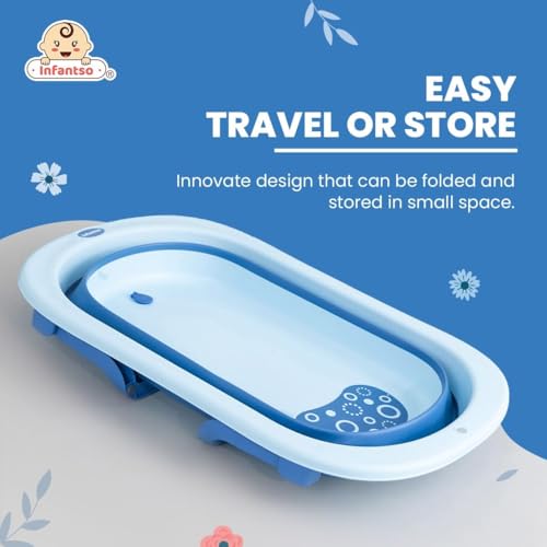 Compact and Innovative Folding Design: The Infantso baby bathtub features an innovative and unique design that can be easily folded and stored in small spaces, making it convenient for homes with limited storage space. After use, simply fold the bathtub and store it away until the next bath time. This space-saving solution allows you to keep your bathroom clutter-free while still providing a comfortable bathing experience for your baby.