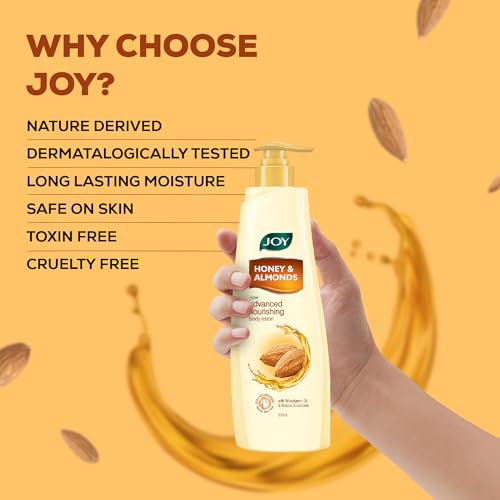 Experience the power of Joy Honey & Almonds Advanced Nourishing Body Lotion, enriched with Almond Oil, Honey, Vitamin E, and Aloe Vera for ultimate nourishment.