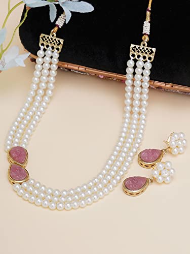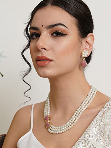 Karatcart Pink Stone Studded Pearl Kundan Necklace Set for Women; Karatcart Pink Stone Studded Pearl Kundan Necklace Set for Women. Our products are designed with high-quality Kundan Stones and these products are enhanced with plating that are skin-friendly & with love to reach your heart.