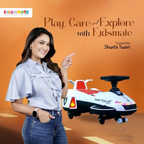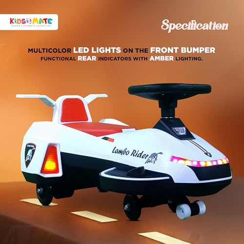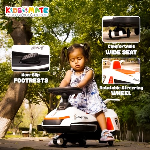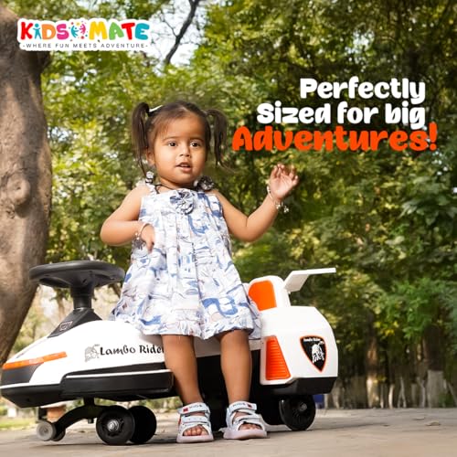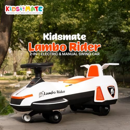 Kidsmate Lambo Rider 2-in-1 Electric & Manual Swing Car | Battery-Operated Ride-On for Kids 1-4 Years | LED Lights, Music & Smooth PU Wheels for Endless Fun - White