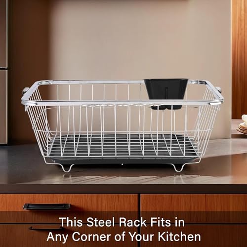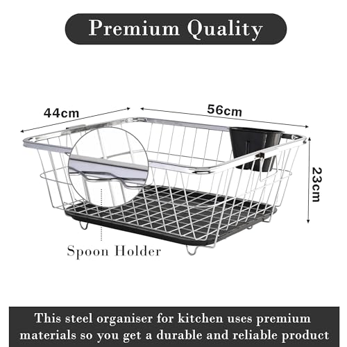 ✅ Package Contains – 1 Piece Dish Rack/Dish Drainer with Tray | Color – Silver | Material – Stainless Steel | Product Dimensions – 56 cm x 44 cm x 23 cm | Tray Dimensions – 45 cm x 35 cm x 3 cm