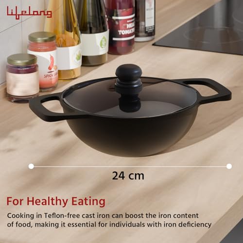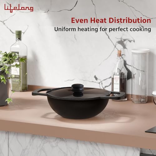 Includes Glass Lid: The kadhai comes with a durable, heat-resistant glass lid that lets you easily monitor your cooking without lifting the lid. This helps retain moisture and heat, ensuring your dishes are cooked evenly and stay flavorful.