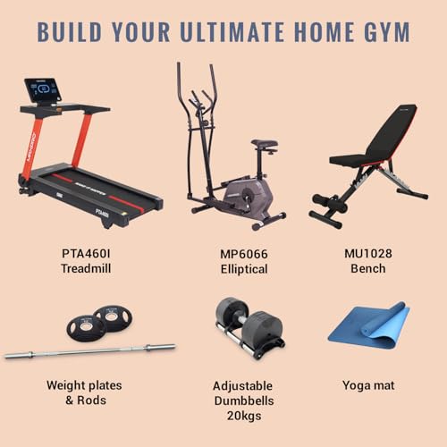 HOME GYM PACKAGE : PTA460I TREADMILL – 1NO, MP6066 ELLIPTICAL TRAINER -1 NO, MU1028 MULTIADJUSTABLE BENCH – 1NO, ADJUSTABLE DUMBBELLS 20KG – 1NO, YOGA MAT – 1NO, WEIGHT PLATE (2.5KGX2, 5KGX2) , 4FT ROD