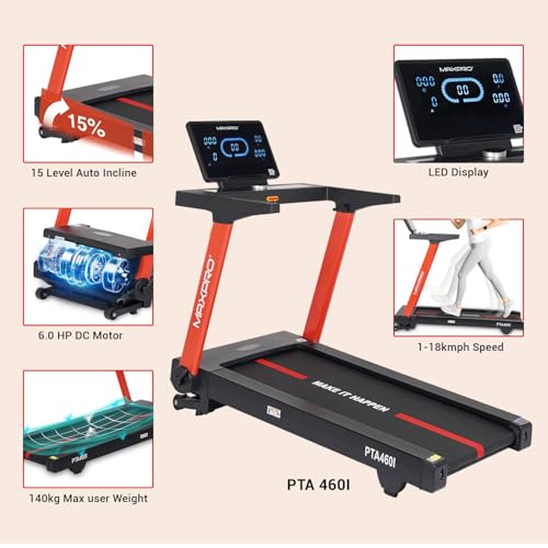PTA460I TREADMILL :Powerful 6HP DC Motor: Unleash the power of a 6-horsepower DC motor, providing a smooth and efficient performance during your workouts.Intuitive LED Display: Stay informed about your workout progress with the easy-to-read LED display.