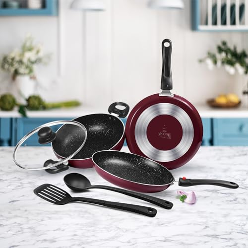 WHAT YOU GET: Color: Peach; Material: Aluminium; Package Content: 5 – Pieces Kitchen Pride Plus Non Induction Set . 1 Piece Non Stick Tawa 25cm, 1 Piece Fry Pan 24cm/1.6 litres, 1 Piece Kadhai with Glass Lid 24cm/2.5 litres, Nylon Laddle & Spatula