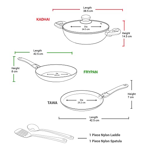 WHAT YOU GET: Color: Peach; Material: Aluminium; Package Content: 5 – Pieces Kitchen Pride Plus Non Induction Set . 1 Piece Non Stick Tawa 25cm, 1 Piece Fry Pan 24cm/1.6 litres, 1 Piece Kadhai with Glass Lid 24cm/2.5 litres, Nylon Laddle & Spatula