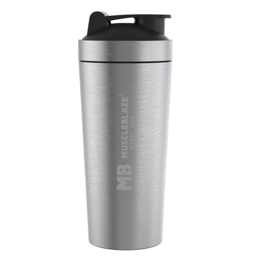 PREMIUM STAINLESS STEEL BOTTLE FOR GYM: MuscleBlaze Steel Pro Shaker of 750 ml capacity is a great choice for gym-goers who want a durable and reusable gym shaker