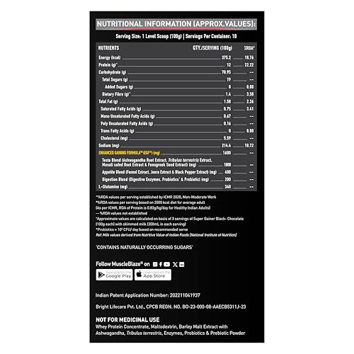 MuscleBlaze Super Gainer Black with Enhanced Gaining Formula™- Appetite, Digestion & Testo Blend for Muscle Mass Gain (Chocolate, 1 kg / 2.2 lb)