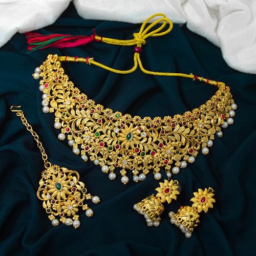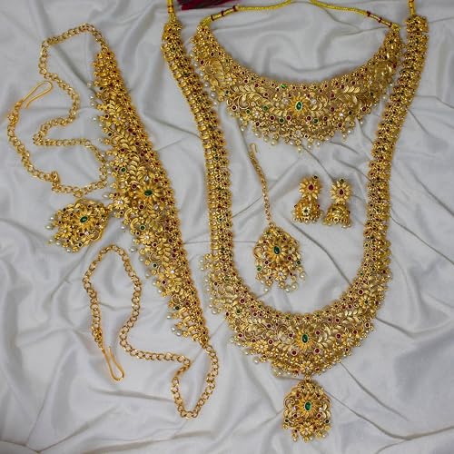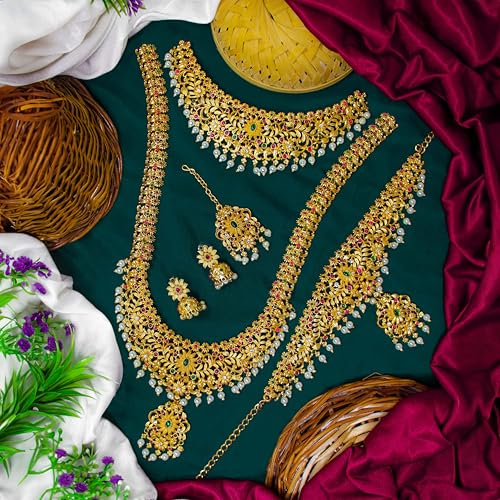 Complete Bridal Jewelry Set: Includes a necklace, earrings, maang tikka, and adjustable vaddanam for a coordinated look.