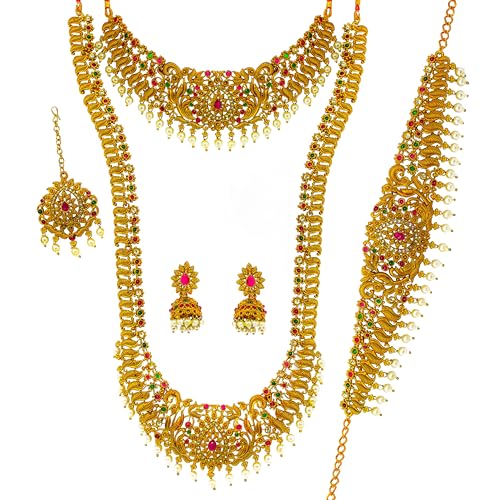 Complete Bridal Jewelry Set: Includes a necklace, earrings, maang tikka, and adjustable vaddanam for a coordinated look.