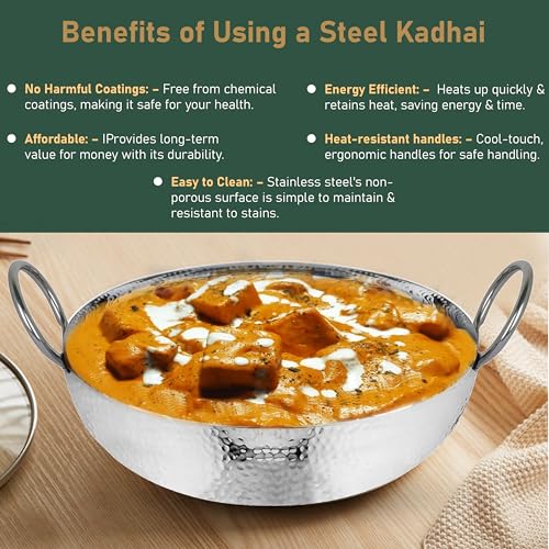 PREMIUM STAINLESS STEEL CONSTRUCTION: Made from high-quality, food-grade stainless steel, this hammered kadhai offers exceptional durability, resistance to rust, and a polished finish that enhances its aesthetic appeal and longevity.