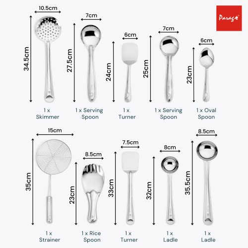 PAKAGE INCLUDE-: We are offering 10 steel kitchen accessories items- 2 Ladles(Karachhi) for cooking, 1 turner(Palta), 2 jhara(Skimmer) for frying, 1 corn server, 1 rice spoon, 1 Oval Spoon, 1 Mini Turner and 1 Mini Basting Spoon for all your cooking and serving needs.