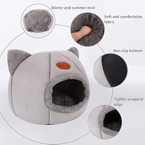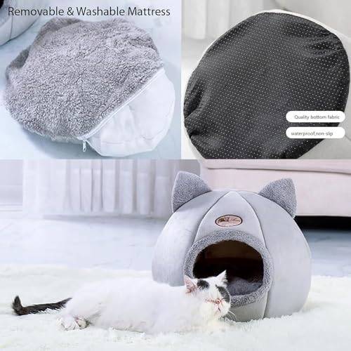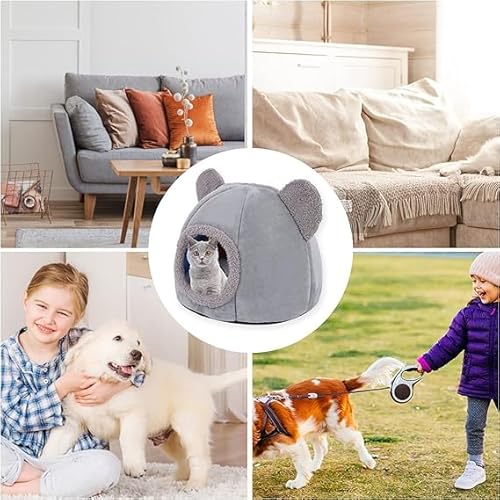 🐾 EXTRAS→ Hanging toy ball at the entrance and multicolored necklace with bell. Nice and warm design, it has a padded type interior cushion and the cave with its soft fleece lining, perfect and closed space to meet your privacy, hiding place so that your kittens feel warm and safe with a very pretty cat shape with ears aesthetically.