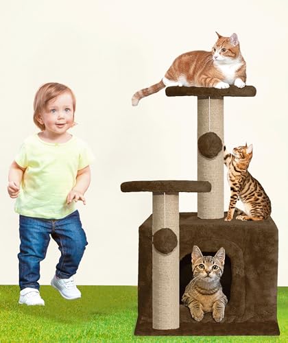 Purrway Soft Fur Activity Cat Tree – Natural Sisal Rope, Condo with Sisal Scratching Post, Hanging Ball Toys for Cats and Kittens (Height 26 Inch) (Brown – FURR-25)