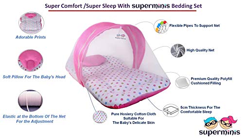superminis Dot Print Cotton Bedding Set Thick Base Foldable Mattress With Mosquito Net And Head Pillow - Zip Closure (Pink, 6-12 Months, Single Size), Baby