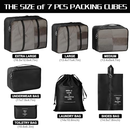 ✈ HOW TO EFFECTIVELY USE THE PACKING CUBES AND LAUNDRY POUCHES: #1 large clothes bag/cubes can fit 10-12 shirts; #2 medium cube can fit another 6-8 shirts; #3 small cube can fit 4-6 shirts; #4 underwear bag for bra underwear and socks; #5 cosmetic bag can fit your make-up, lipstick and personal cosmetics #6 toiletry bag for your toiletry accessories and electronic accessories; #7 BONUS drawstring bag for shoe bag which can fit 1 pair of slippers and 1 pair of sneakers. You can also use laundry.