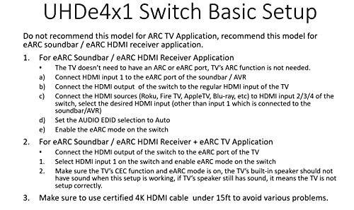 This UHDe4X1 HDMI 2.0 4K@60Hz HDR Dolby Vision Switch is made to work with latest generation HDMI sound bar and receiver with an eARC or ARC HDMI port. The package includes: the UHDe4X1 switch, 100V-240V AC to 5V DC power adapter with US plug, IR remote and user manual. Support lastest Apple TV with eARC function. This switch is HDMI v2.0, if your HDMI source is HDMI v2.1, such as PS5, make sure to disable v2.1 video features to avoid no video problems.