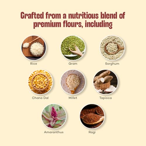 Made from a mix of protein rich flours like Rice, Gram, Sorghum, Chana Dal, Millet, Tapioca, Amaranthus and Ragi.