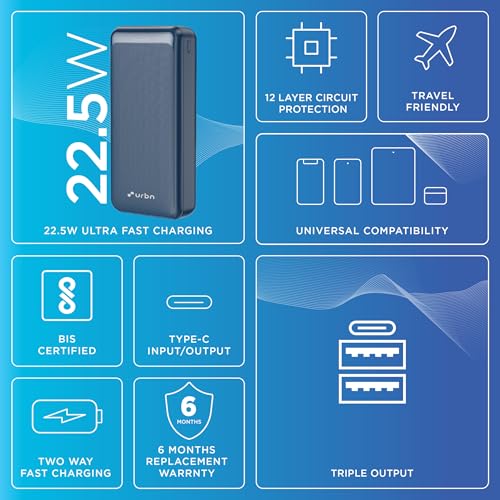 URBN Power Bank 20000mAh Fast Charging | 22.5W Super Fast Power Delivery (PD) Portable Charger | Triple Output | USB Type C Input & Output | Pass Through Charging | (Blue)