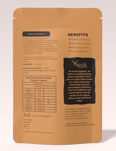 100% Natural & Pure Himalayan Rock Salt: Vanvik Organics brings you unrefined and naturally harvested pink salt, directly sourced from ancient salt mines in the Himalayan foothills. This authentic Sendha Namak is free from chemicals, preservatives, or artificial additives, making it a healthy, clean choice for daily cooking.