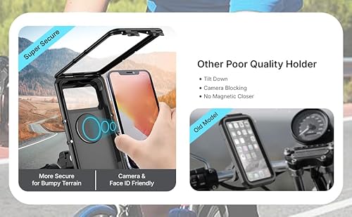 𝗠𝗮𝗴𝗻𝗲𝘁𝗶𝗰 𝗦𝘂𝗰𝘁𝗶𝗼𝗻 Mobile Holder for Bikes : The waterproof mobile holder for bikes has a built-in magnet . The 𝗯𝘂𝗶𝗹𝘁-𝗶𝗻 𝗺𝗮𝗴𝗻𝗲𝘁 keeps the device intact and stops it from tilting or moving over uneven terrain and keeps the mobile holder entact .
