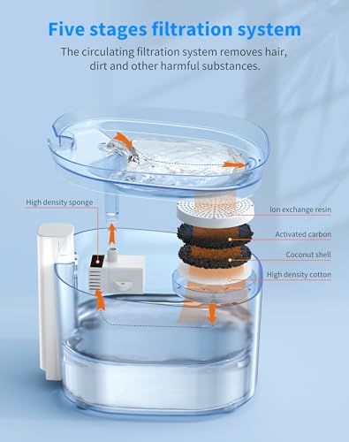 【Circulating filtration system】 -the circulating filtration system uses a replaceable charcoal filter to purify the water, remove hair, dirt and food particles. Includes replaceable carbon water filter that removes bad tastes and odors, keeping water fresh.For your pet health, it’s recommended to change the filters, clean the pump and fountain every 2-4 weeks.(comes with 2pcs replacement filters)