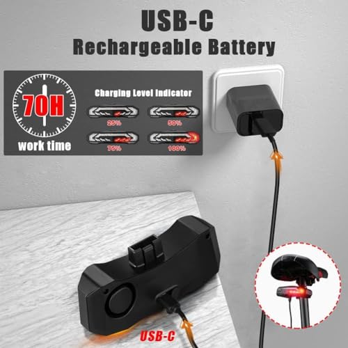 WIRELESS REMOTE & USB RECHARGEABLE – Come with wireless remote which clamps easily to 0.78-0.94 inch handlebar. The remote with button lock function to avoid accidental triggering. Strong wireless range about 98ft-196ft. Bike tail light rechargeable comes with USB-C charging cable, build in rechargeable lithium battery, about 6h full charge the taillight alarm can work up to 70 hours (on fast blinking mode)
